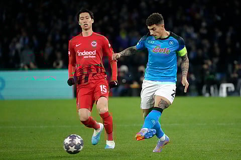 واعتمد نابولي أمام إينتراخت فرانكفورت على تشكيلة مكونة من: أليكس ميريت، جيوفاني دي لورينزو، كيم مين-جاي، ماريو روي، أمير رحماني، فرانك أنجويسا، ستانيسلاف لوبوتكا، بيتور زيلينسكي، ماتيو بوليتانو، فيكتور أوسيمين، خفيتشا كفاراتسيخليا.